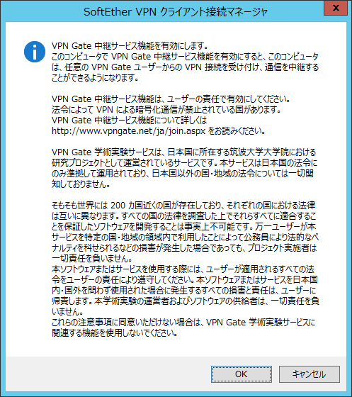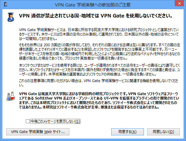 初めて VPN Gate クライアントを起動しようとすると、VPN Gate
