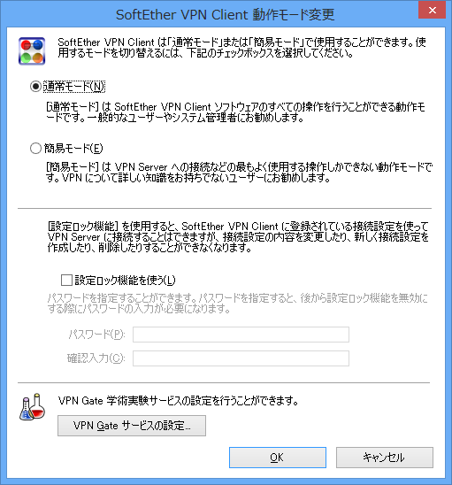 動作モード変更画面上にある「VPN Gate サービスの設定」ボタンをクリックしてください。